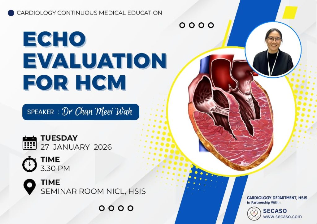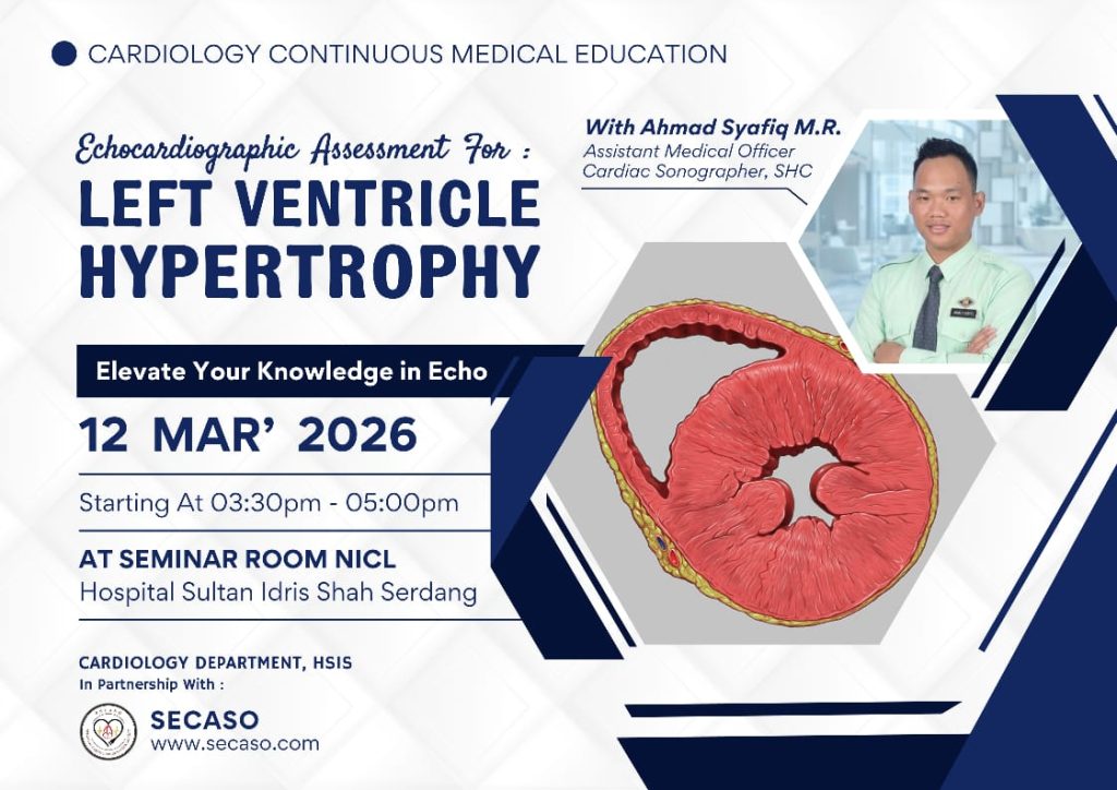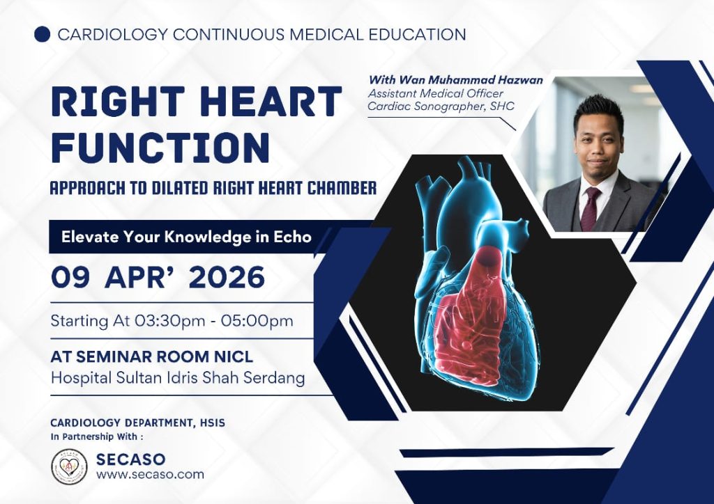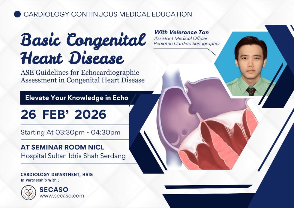 As part of our ongoing contribution to the cardiac sonographer community in Malaysia—especially in Selangor—SECASO is proud to introduce a free Continuing Medical Education (CME) platform at Hospital Sultan Idris Shah, Serdang, starting in 2026.